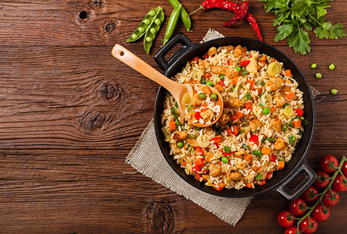 Poêlée de riz aux blettes et pignons de pin à la feta et au gingembre