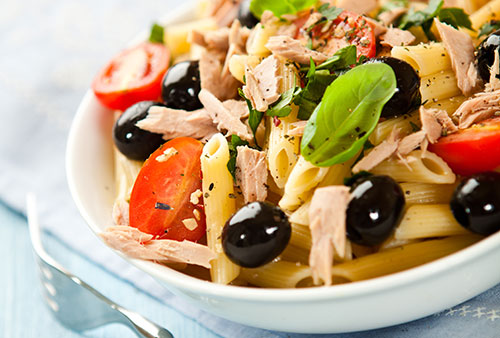 3. Bien mélanger le thon, les tomates, les olives, les câpres et les épinards avec les pâtes.